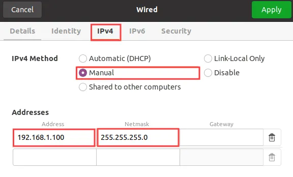 In the wired settings go to IPv4 tab, choose manual IPv4 method, type in the IP