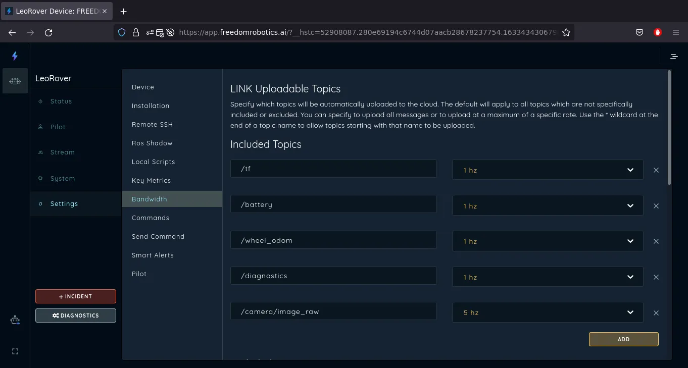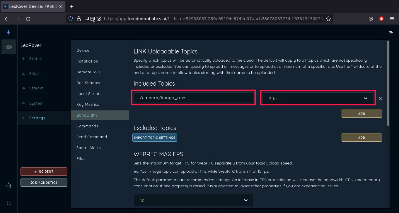 Now, connect to your device via Freedom Robotics and go to the device Settings and then go to the Bandwidth section.