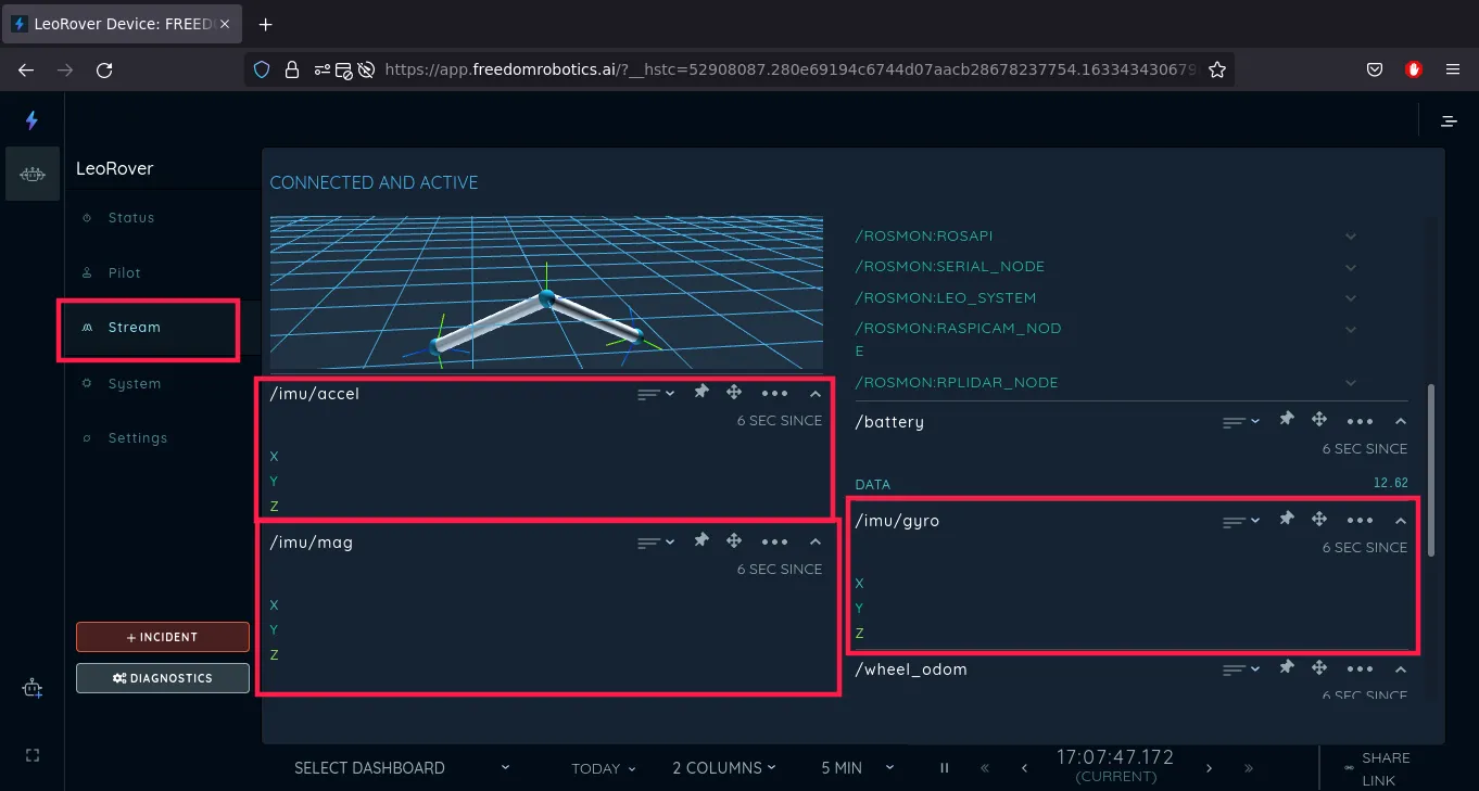 Now, in the Stream section you can see data from the IMU topics.