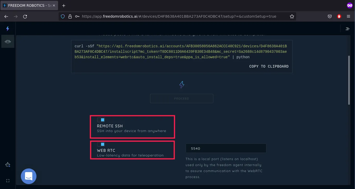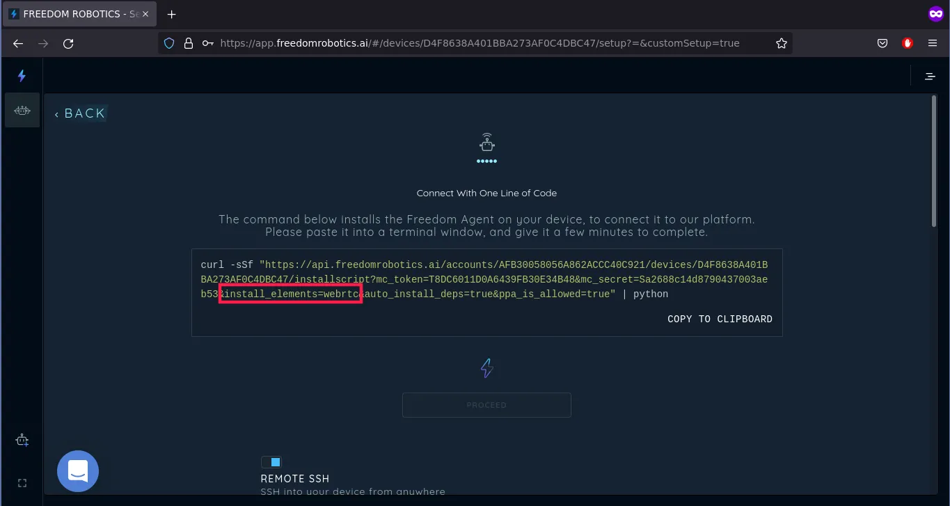 No matter what option you chose, the next step is the same. After a short time, we get a custom curl command that will install the Freedom Robotics agent when executed on our rover.