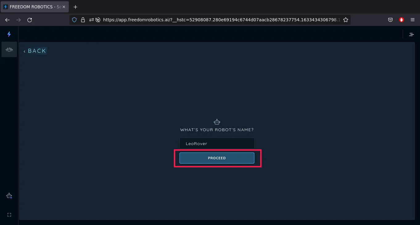 will continue with LeoRover. Enter your robot's name and click the PROCEED